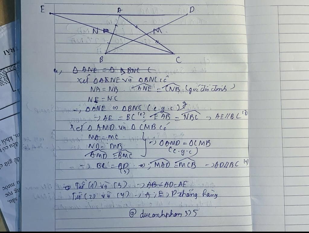 cho tam giác ABC gọi M,N lần lượt là trung điểm của AC và AB trên tia đối của tia MB và NC, lấy tương ứng hai điểm D và E sao cho MD bằng MB và NE bằng NC, A. chứng minh AD bằng AE, B. chứng minh A,E,D thẳng hàng.