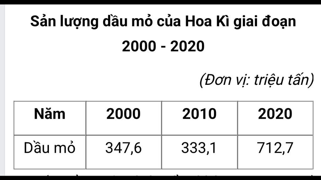 Cho bảng số liệu: SẢN LƯỢNG DẦU MỎ CỦA HOA KÌ GIAI ĐOẠN 2000 - 2020