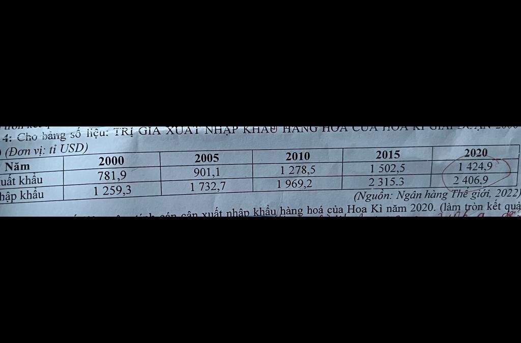 Căn cứ vào bảng số liệu trên, tính cán cân xuất nhập khẩu hàng hoá của Hoa Kì năm 2020. (làm tròn kết quả, đến hàng đơn vị của tỉ USD)
