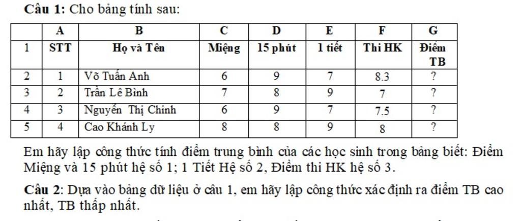 Theo em, công thức để tính điểm trung bình của các học sinh trong bảng kia là: