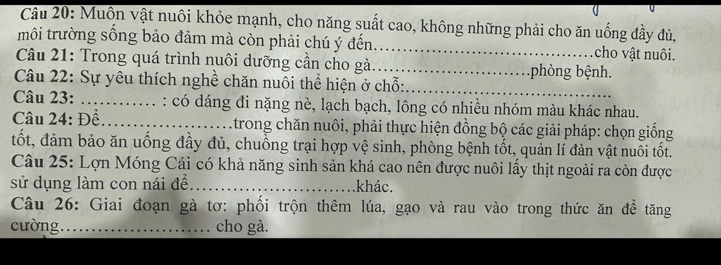 `20.` Muốn vật nuôi khỏe mạnh, cho năng suất cao, không những phải cho ăn uống đầy đủ, môi trường sống bảo đảm mà còn phải chú ý đến chăm sóc cho vật nuôi