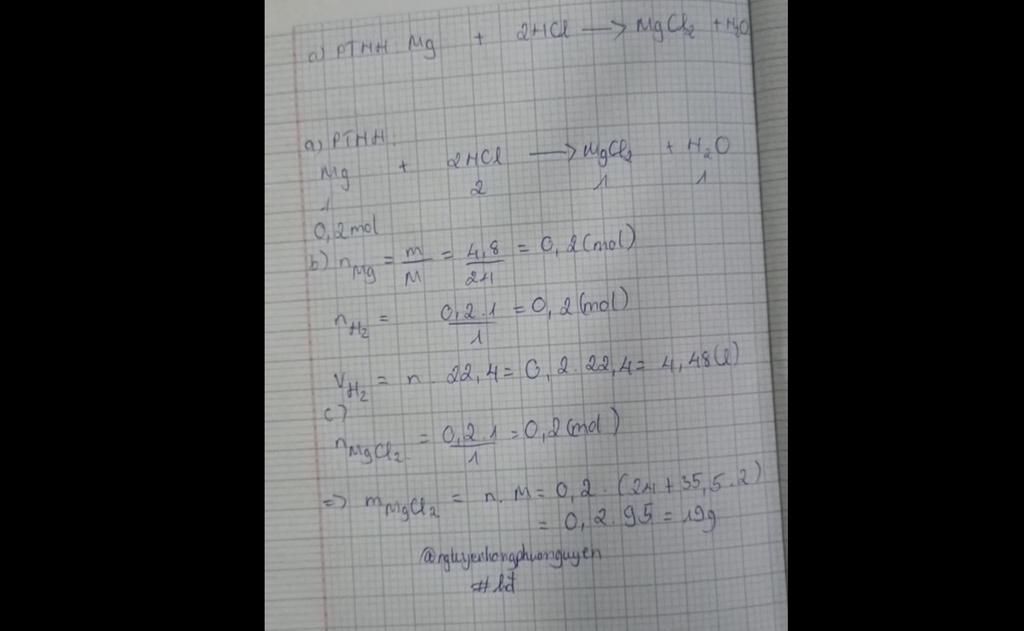 PTHH: `Mg + 2HCl -> MgCl_2 + H_2`$\uparrow$
