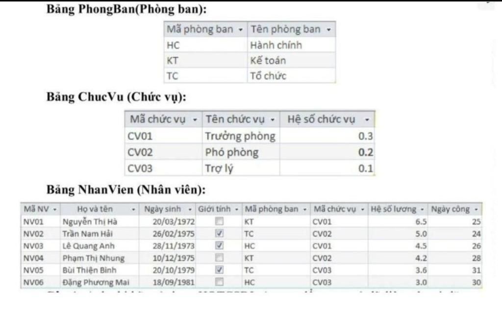 Bt3: Cho CSDL quản lí nhân viên gồm các bảng sau:(hình ảnh đó là bt3 nha)