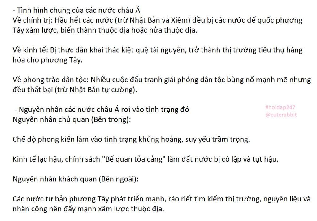 Cứu em với ạ Câu 4. Trình bày tình hình chung của các nước châu Á từ nửa sau thế kỉ XIX đến đầu thế kỉ XX. Vì sao các nước châu Á rơi vào tình trạng đó?