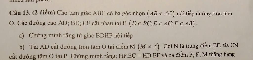 Câu 13. (2 điểm) Cho tam giác ABC có ba góc nhọn (AB < AC) nội tiếp đường tròn tâm