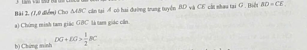 a) Vì $BD$ và $CE$ là hai đường trung tuyến cắt nhau tại $G$ nên $G$ là trọng tâm $\triangle ABC$
