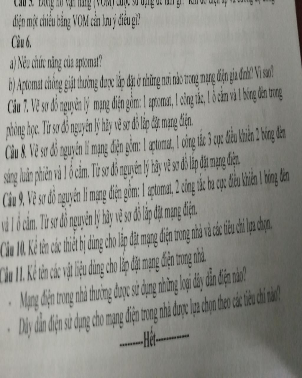 Câu 7. Vẽ sơ đồ nguyên lý mạng điện gồm: 1 aptomat, 1 công tắc, 1 ổ cắm và 1 bóng đèn trong