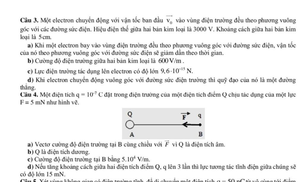 a) Electron chuyển động theo phương vuông góc với đường sức điện không chịu tác dụng của lực điện theo phương này, do đó vận tốc theo phương vuông góc với đường sức điện không đổi ($v = v_0 = \text{const}$). $\Rightarrow$ Sai