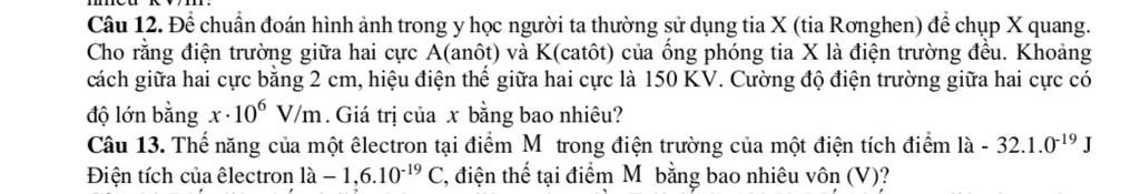 12. $E=\dfrac Ud=\dfrac{150.10^3}{2.10^{-2}}=7,5.10^6$