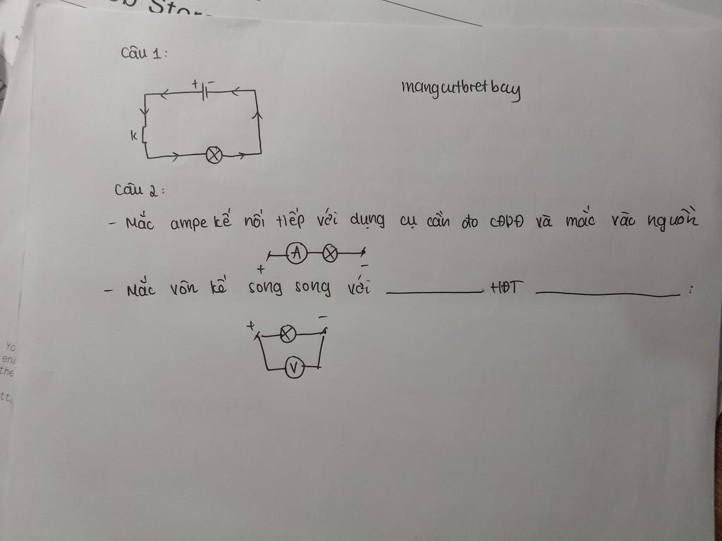 Câu 1: Vẽ sơ đồ mạch điện gồm 1 nguồn điện, 1 bóng đèn, 1 khoá k, 1 công tắc đóng, các dây dẫn. Vẽ chiều dòng điện trong mạch ?