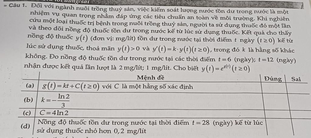 Theo đề bài $y(t) = e^{g(t)} \Rightarrow g(t) = kt + C \Rightarrow \text{mệnh đề a) đúng}$