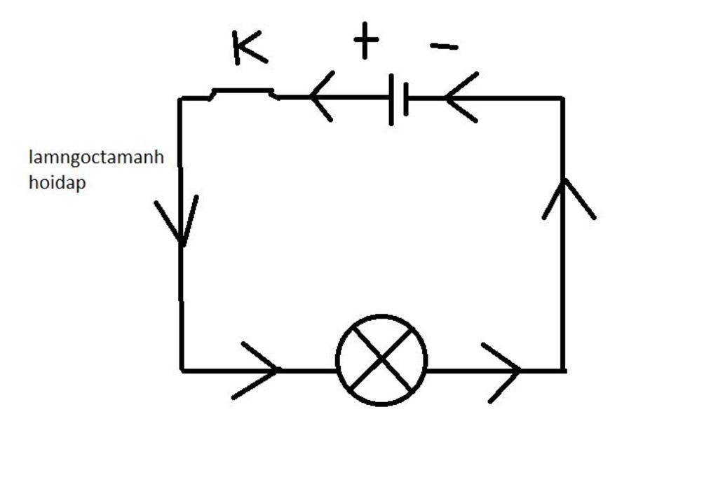 Vẽ sơ đồ mạch điện gồm 1 nguồn điện, 1 bóng đèn, 1 khóa K, 1 công tắc đóng, các dây dẫn. Vẽ chiều dòng điện trong mạch?