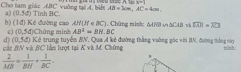 d) (0,5đ) Kẻ trung tuyến BN. Qua A kẻ đường thẳng vuông góc với BN, đường thẳng này