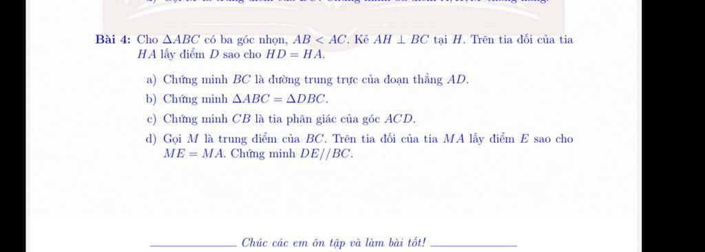Giải thích các bước giải:Bài 4:a) Chứng minh là đường trung trực của đoạn thẳng