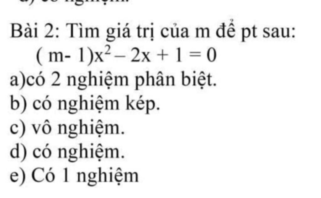 Vậy `m <2 ; m \ne 1` thì pt có 2 nghiệm phân biệt.