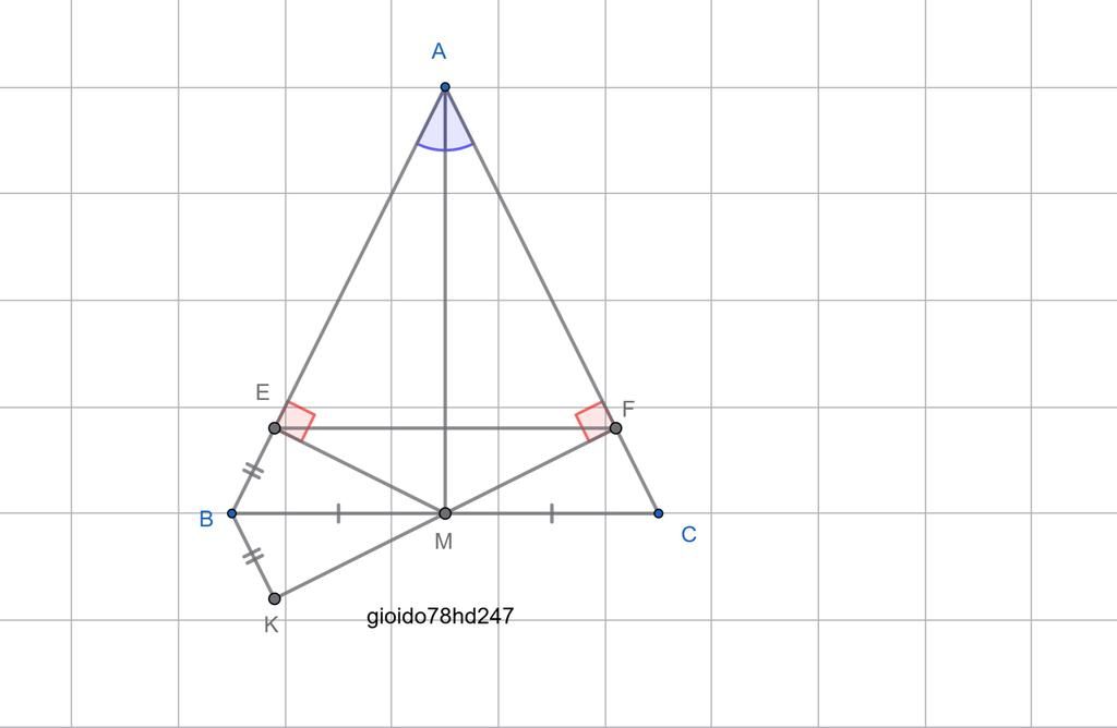 Suy ra `ΔBMK = ΔCMF ( c.g.c)` Suy ra `MK = MF`