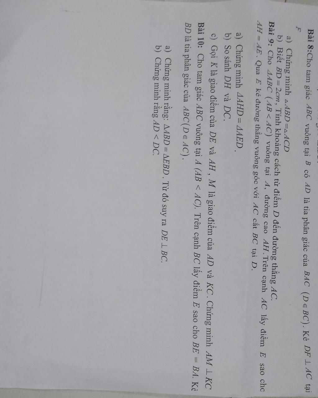 Bài 8:Cho tam giác ABC vuông tại B có 4D là tia phân giác của BẠC (DeBC). Kẻ DF LAC tại