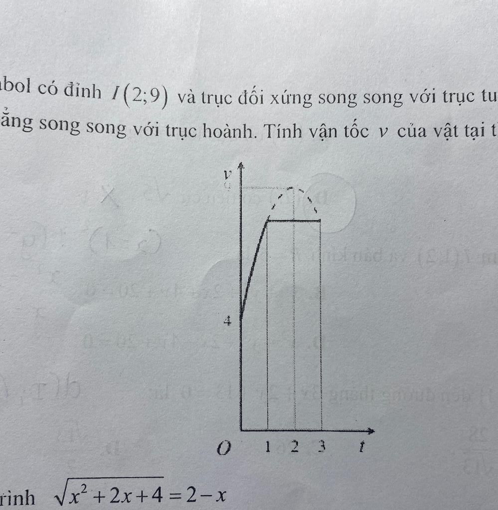 Một vật chuyển động trong 3 giờ với vận tốc v ( km/h ) phụ thuộc vào thời gian t (h) có đồ thị của hàm số vận tốc như hình dưới.Trong khoảng thời gian 1 giờ kể từ khi bắt đầu chuyển động, đồ thị đó là một phần của đường parabol có đỉnh I(2,9) và trục đối xứng song song với trục tung , khoảng thời gian còn lại đồ thị là một đoạn thẳng song song với trục hoành. Tính vận tốc v của vật tại thời điểm t=3