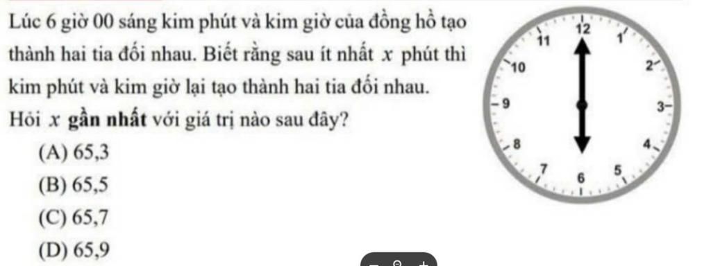 Để kim phút và kim giờ tiếp tục tạo thành $2$ tia đối nhau thì góc quay được của kim phút phải lớn hơn góc quay được của kim giờ ít nhất là $1$ vòng đồng hồ $= 360^\circ$