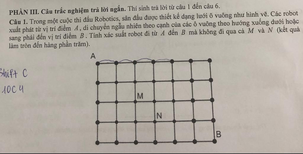 Số cách đi qua điểm $M$ hoặc điểm $N$ là:$$90 + 80 - 48 = 122 \text{ cách}$$Số cách đi từ $A$ đến $B$ mà không đi qua cả $M$ và $N$ là:$$210 - 122 = 88 \text{ cách}$$Xác suất cần tìm:$$P = \frac{88}{210} \approx 0,42$$ .