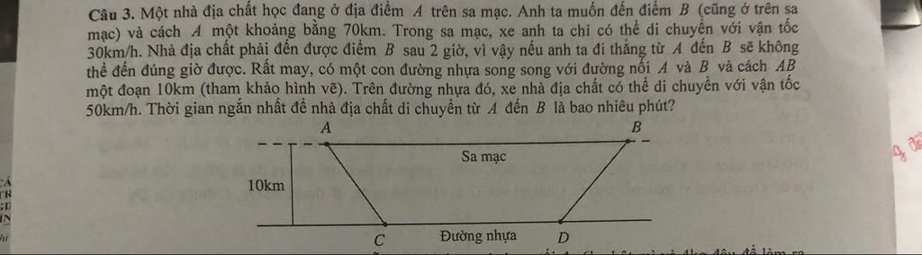 $$T_{min} = \frac{\sqrt{100 + 7,5^2}}{15} + \frac{35 - 7,5}{25} = \frac{12,5}{15} + \frac{27,5}{25} = \frac{5}{6} + \frac{11}{10} = \frac{29}{15} \text{ (giờ)}$$