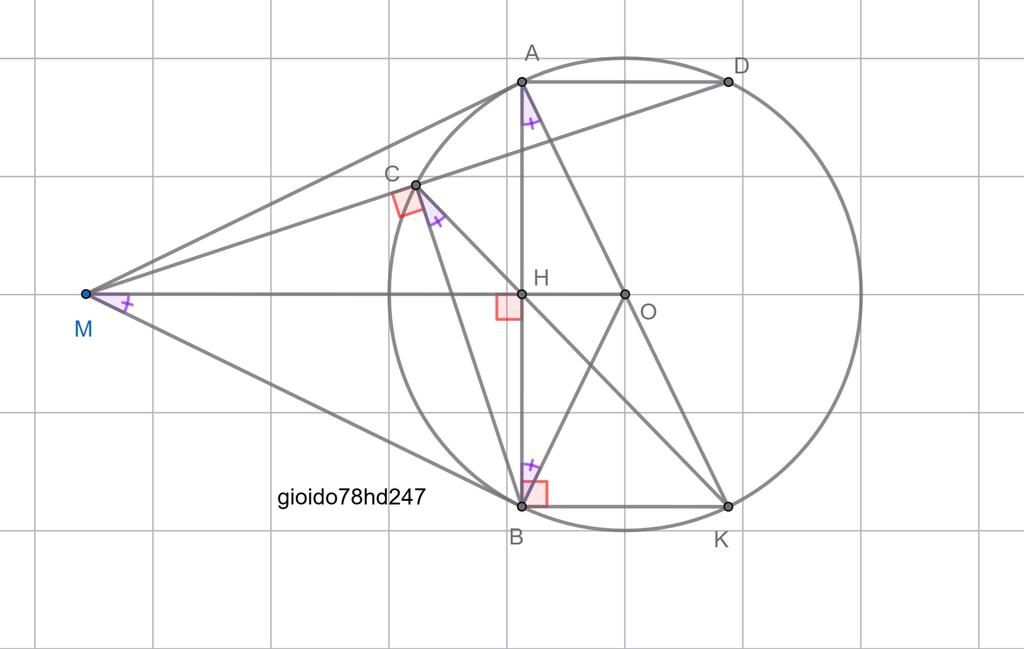 Suy ra `\hat{HMB} = \hat{KCB} = \hat{HCB} ( H ∈ CK)`