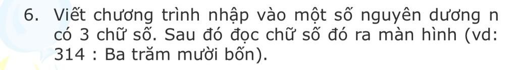 Bài 6: Viết chương trình nhập vào một số nguyên dương n có 3 chữ số, sau đó đọc số đó ra chữ.
