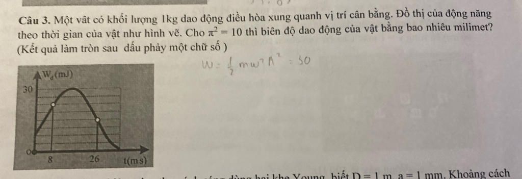 Câu 3. Một vật có khối lượng 1kg dao động điều hòa xung quanh vị trí cân bằng. Đồ thị của động năng