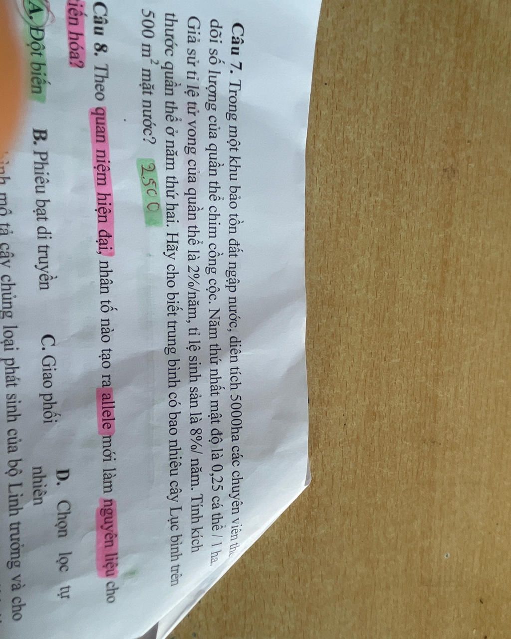 Câu 7. Trong một khu bảo tồn đất ngập nước, diện tích 5000ha các chuyên viên thị