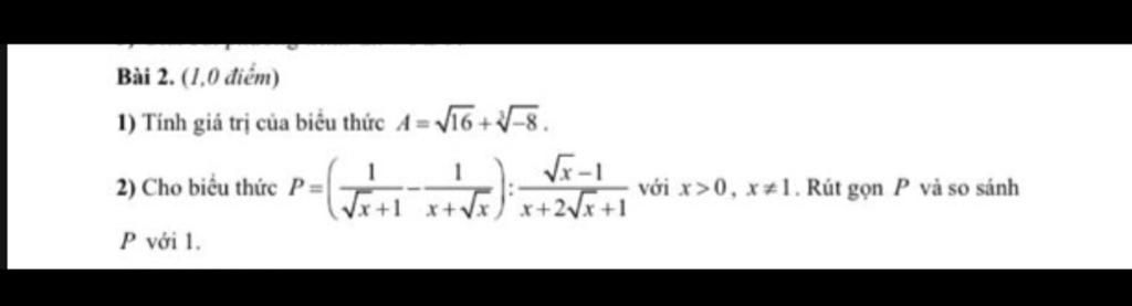 `P = (1/(\sqrt{x} + 1) - 1/(x + \sqrt{x}) ) : (\sqrt{x} - 1)/(x + 2\sqrt{x} + 1)` `( x> 0 ; x\ne 1 )`