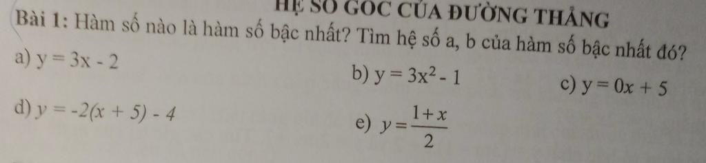 `c)` `y=0x+5` không là hàm số bậc nhất (vì `a!=0`)