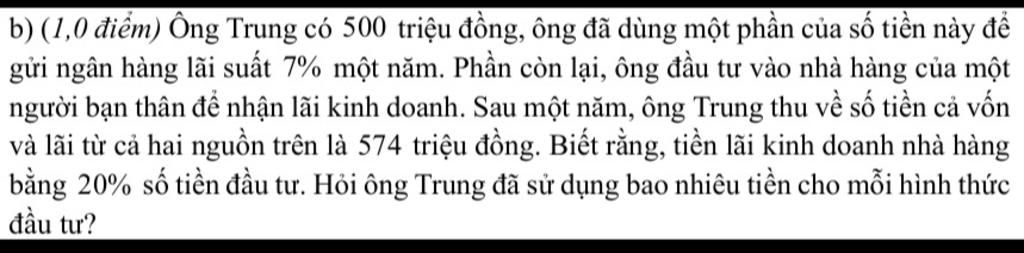 Vậy ông Trung gửi ngân hàng `200` triệu và kinh doanh `300` triệu
