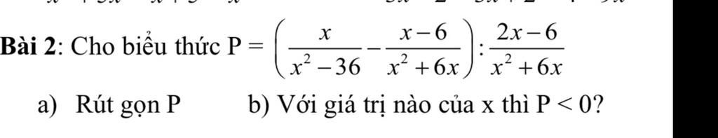 `a)``P``=(x/(x^2-36) - (x-6)/(x^2+6x)) : (2x-6)/(x^2+6x)`