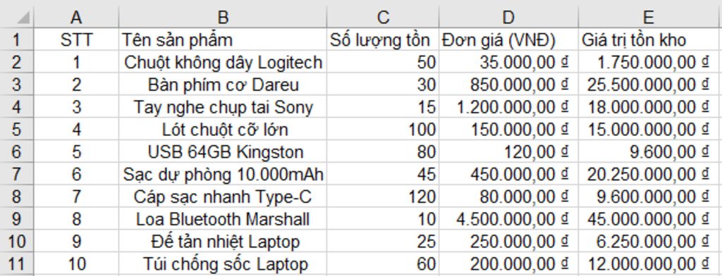 Em hãy tưởng tượng mình là một người quản lý kho hàng. Em cần tạo một bảng tính để theo dõi số lượng hàng tồn kho và tính toán giá trị hàng tồn kho. Bảng tính bao gồm các cột: “Tên sản phẩm”, “Số lượng tồn”, “Đơn giá”, và “Giá trị tồn kho”.