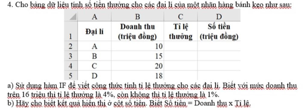 a) Sử dụng hàm IF để viết công thức tính tỉ lệ thưởng cho các đại lí. Biết với mức doanh thu trên 16 triệu thì tỉ lệ thưởng là 4%, còn không thì tỉ lệ thưởng là 1%.
