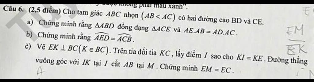 Câu 6. (2,5 điểm) Cho tam giác ABC nhọn (AB < AC) có hai đường cao BD và CE.
