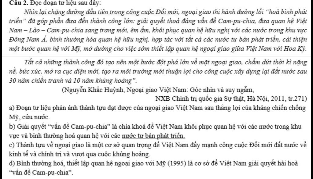 `->` Đoạn tư liệu trên không phản ánh thành tựu ngay sau kháng chiến chống Mỹ, mà là thành tựu ngoại giao trong thời kỳ Đổi mới vào sau năm 1986.
