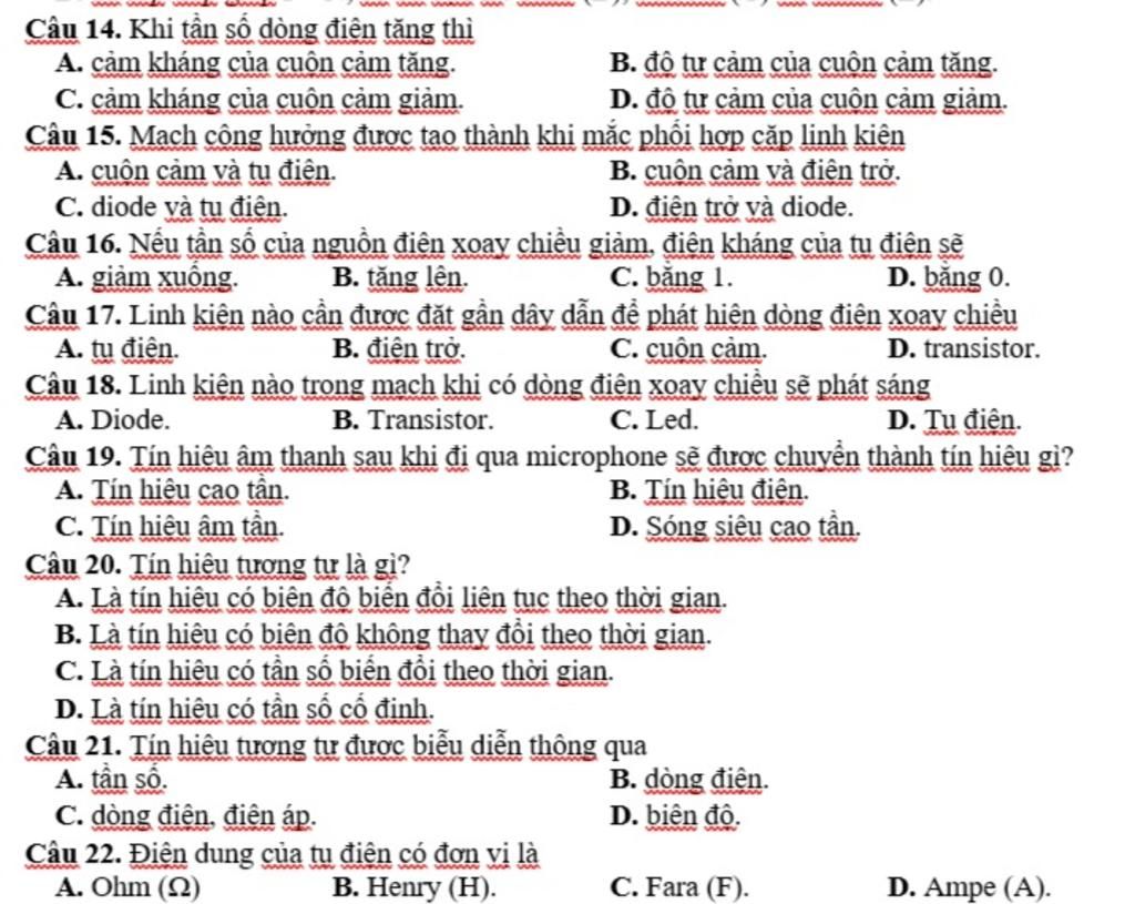 Câu 15. Mạch cộng hưởng được tạo thành khi mắc phối hợp cặp linh kiện
