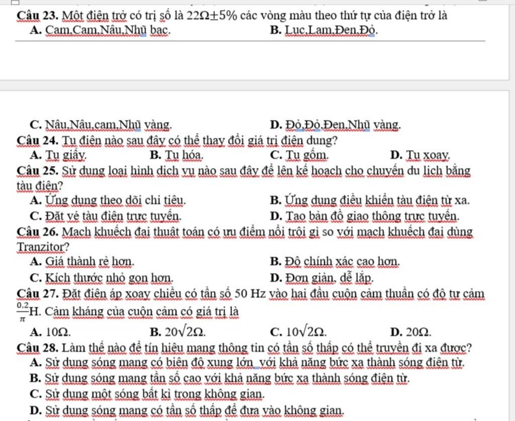 Câu 23. Một điện trở có trị số là 22Q±5% các vòng màu theo thứ tự của điện trở là