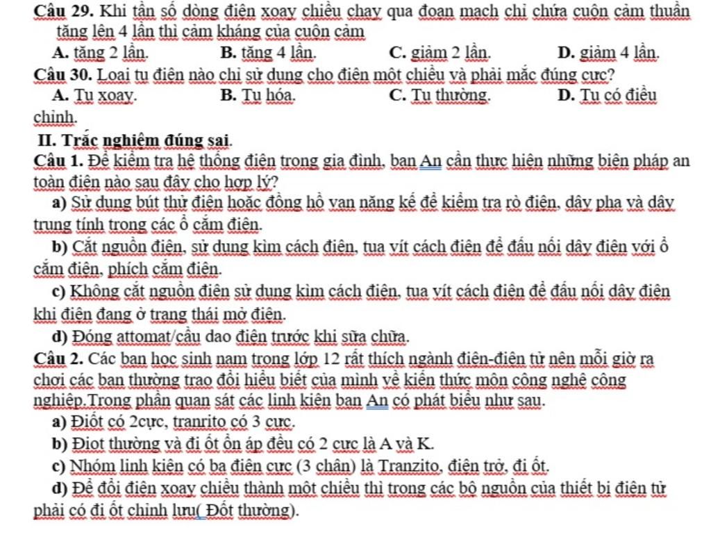 Câu 30. Loại tụ điện nào chỉ sử dụng cho điện một chiều và phải mắc đúng cực?