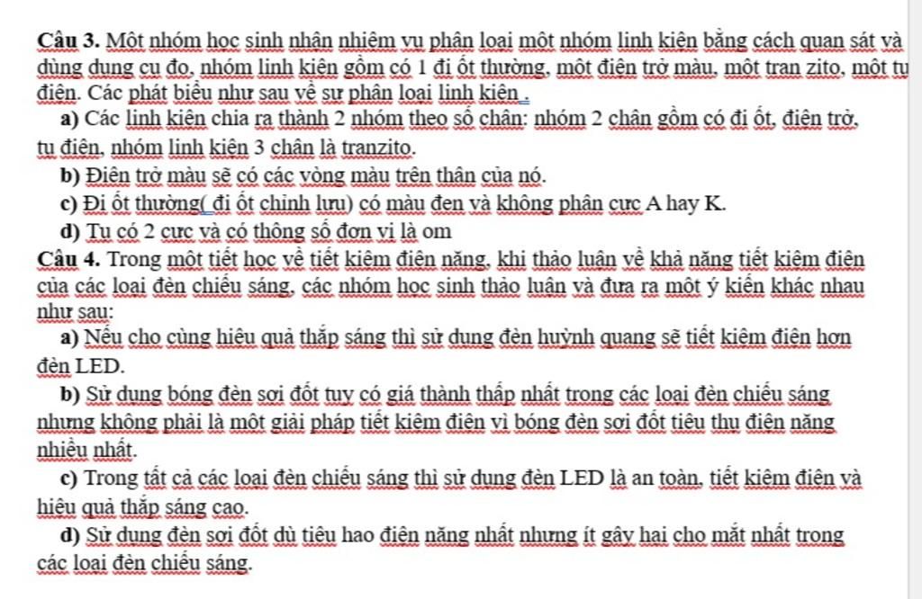 Câu 3. Một nhóm học sinh nhận nhiệm vụ phân loại một nhóm linh kiện bằng cách quan sát và
