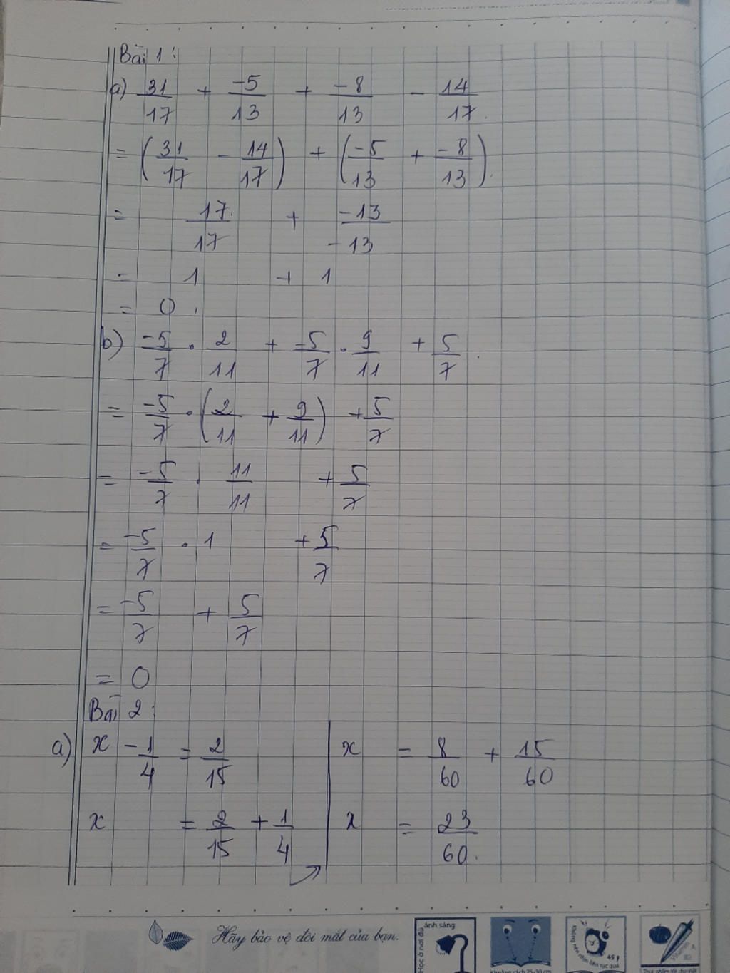 Bài 1: a,31/17 + -5/13+ -8/13- 14/17 =(31/17- 14/17)+(-5/13+ -8/13) =1+(-1) =0