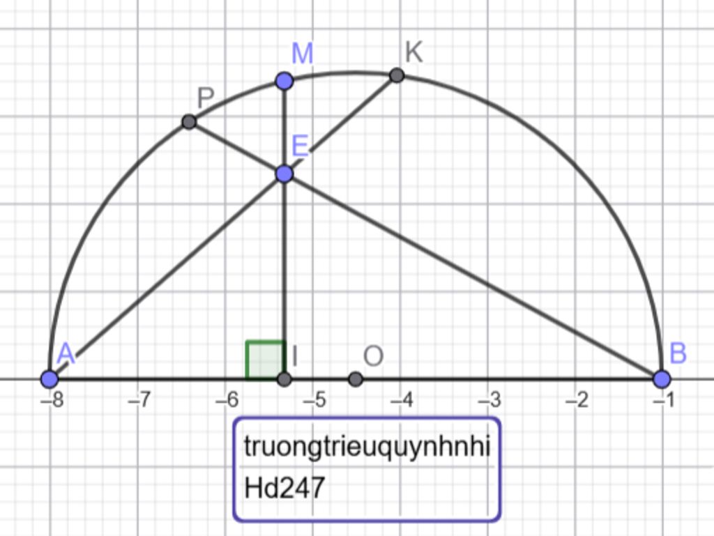 Cho nửa đương tròn tâm O đường kính AB = 2R. Từ điểm M thuộc nửa đường tròn (O; R) kẻ MI vuông góc với AB tại I sao cho IA < IB. Trên đoạn thẳng MI lấy điểm E (E khác M và I). Tia AE cất nửa đường tròn (O;R) tại điểm thứ hai là K. tia BE cất nữa đường tròn (O; R) tại điểm thứ hai là P.