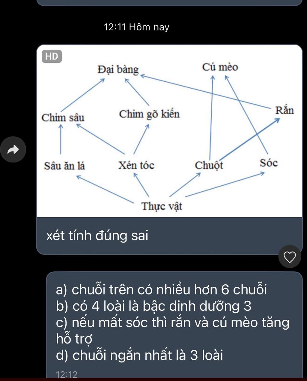 b) Bậc dinh dưỡng 1 là thực vật, Bậc dinh dưỡng 2 là loại ăn thực vật, Bậc dinh dưỡng 3 là loài ăn các loài bậc dinh dưỡng 2. Có 5 loài bậc dinh dưỡng 3 là: Chim sâu, chim gõ kiến, đại bằng, cú mèo, rắn