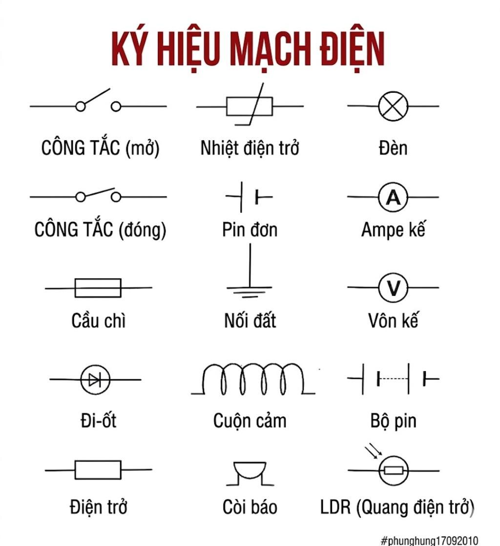 `+`Nguồn điện (Pin, acquy, ổ cắm): Cung cấp năng lượng điện cho mạch hoạt động.