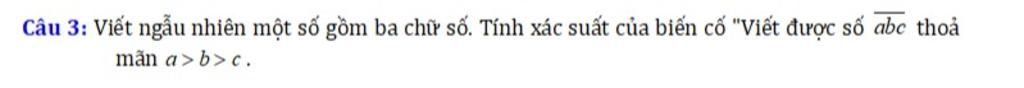 Gọi $A$ là biến cố: "Viết được số $\overline{abc}$ thoả mãn $a > b > c$"