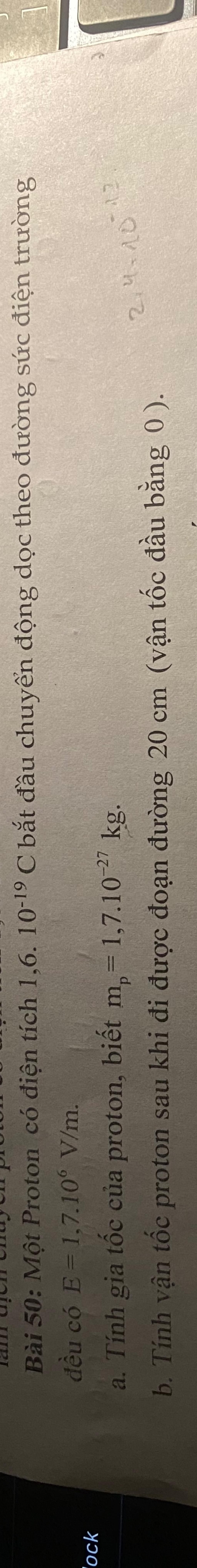 b. Tính vận tốc proton sau khi đi được đoạn đường 20 cm (vận tốc đầu bằng 0 ).