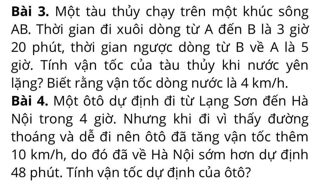 Vận tốc của tàu thủy khi xuôi dòng từ A đến B là $x + 4$ (km/h) và vận tốc của tàu thủy khi ngược dòng từ B về A là $x - 4$ (km/h).