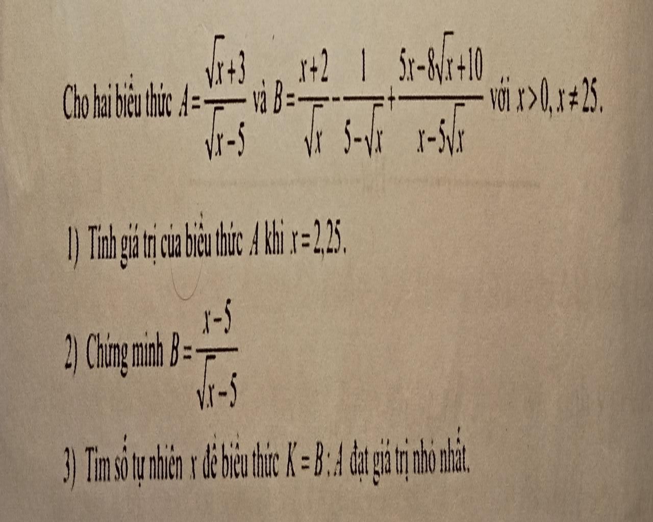 & \text{2) Chứng minh } B = \dfrac{x - 5}{\sqrt{x} - 5}. \\