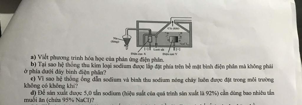 b) Tại sao hệ thống thu kim loại sodium được lắp đặt phía trên bề mặt bình điện phân mà không phải